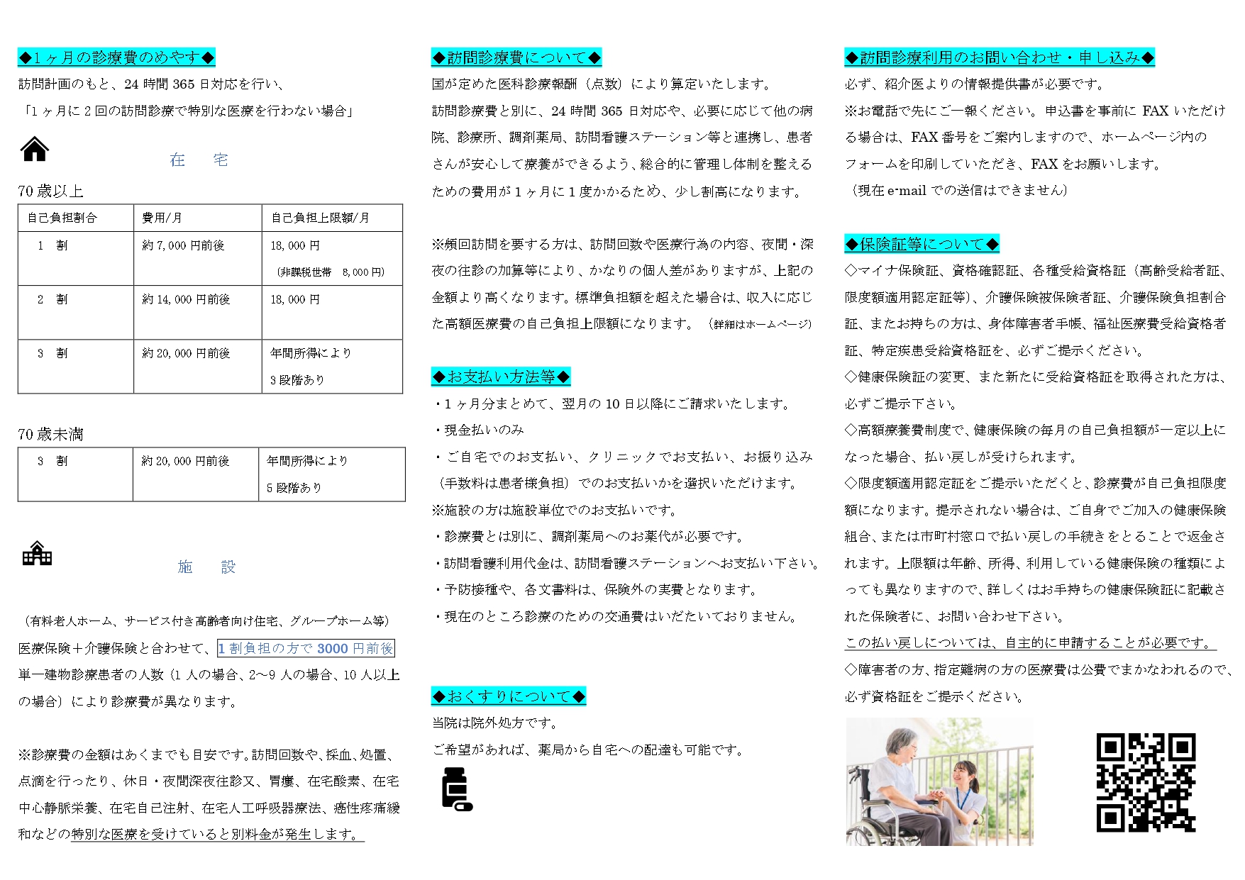 当院は訪問診療・往診が中心ですので通院による一般外来診療や健診は、積極的には行っておりません。